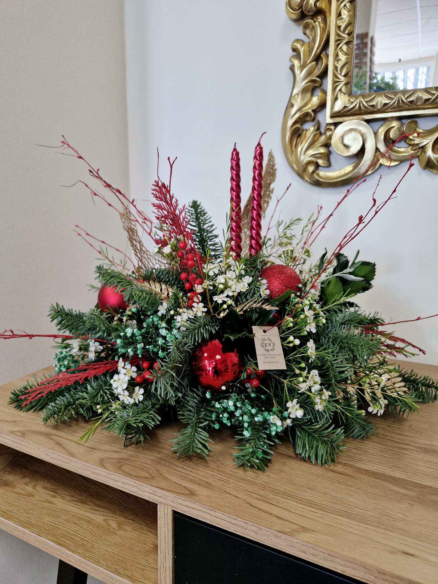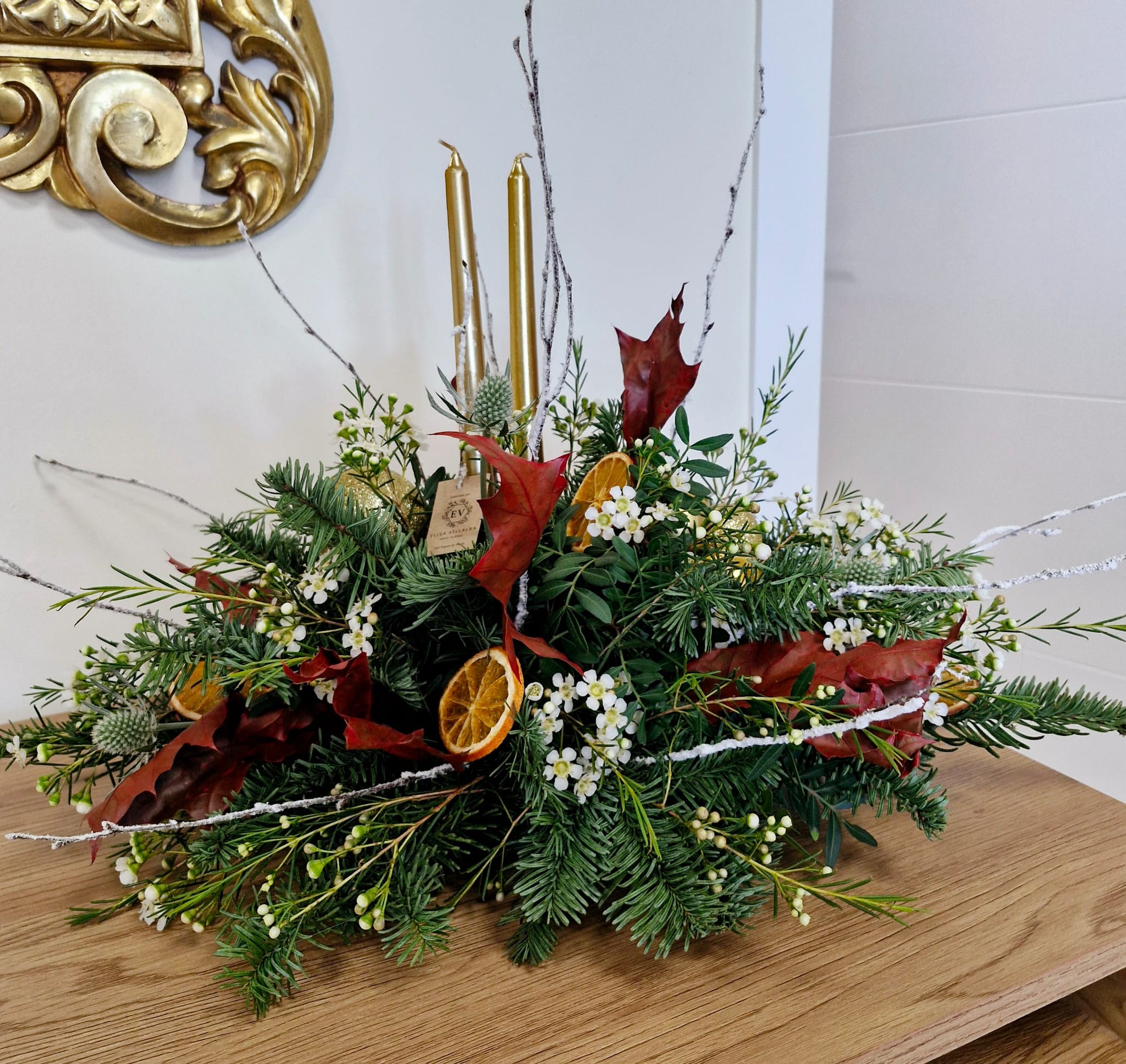 Centro de mesa con velas elaborados artesanalmente en nuestro taller con abeto, naranja, algodón, canela, etc. Todo productos naturales que harán que tu hogar huela a Navidad.