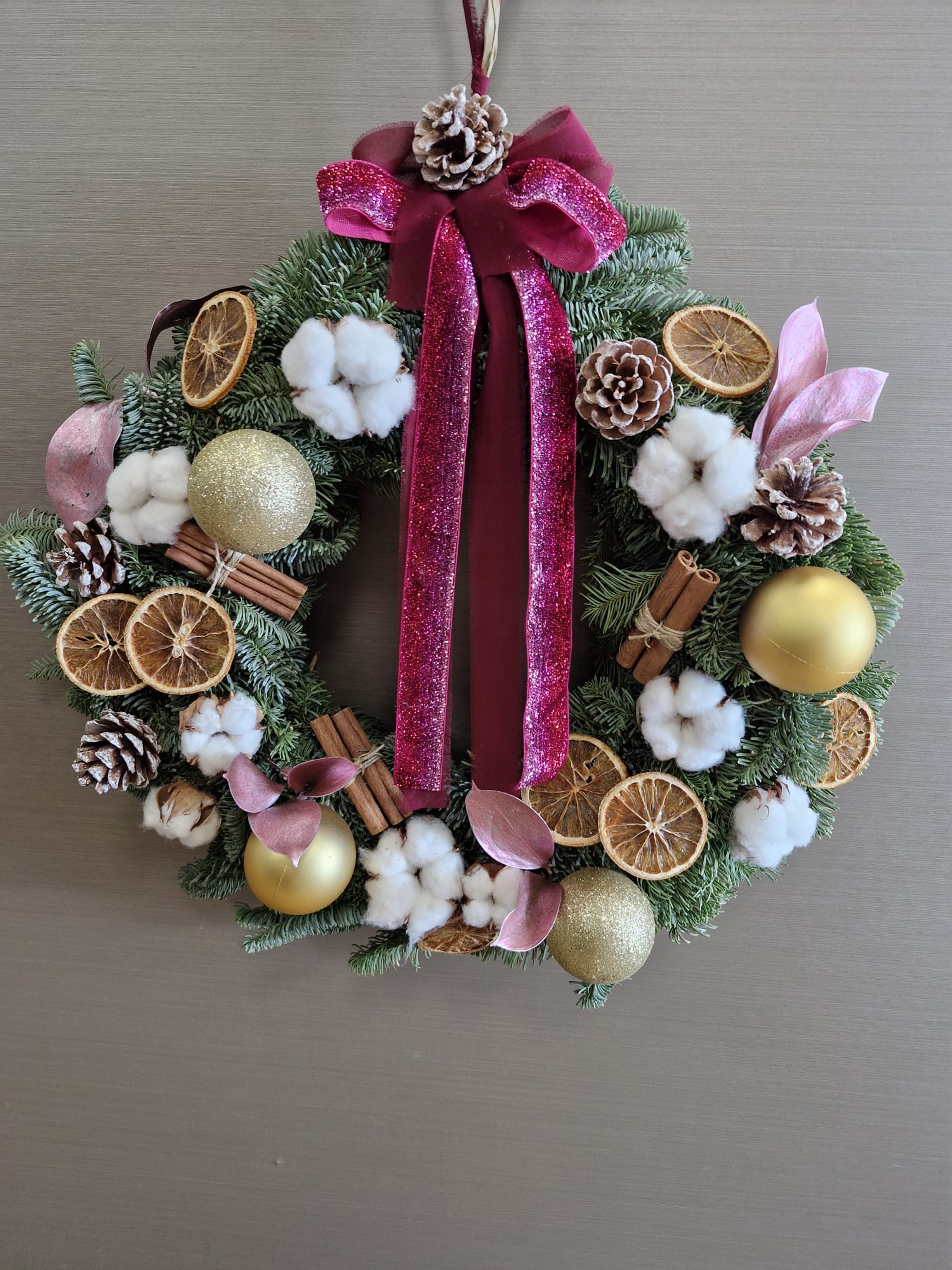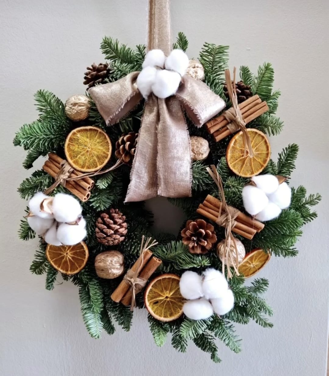 Corona Navideña de 40 cm elaborada artesanalmente en nuestro taller con abeto, naranja, algodón, canela, etc. Todo productos naturales que harán que tu hogar huela a Navidad.