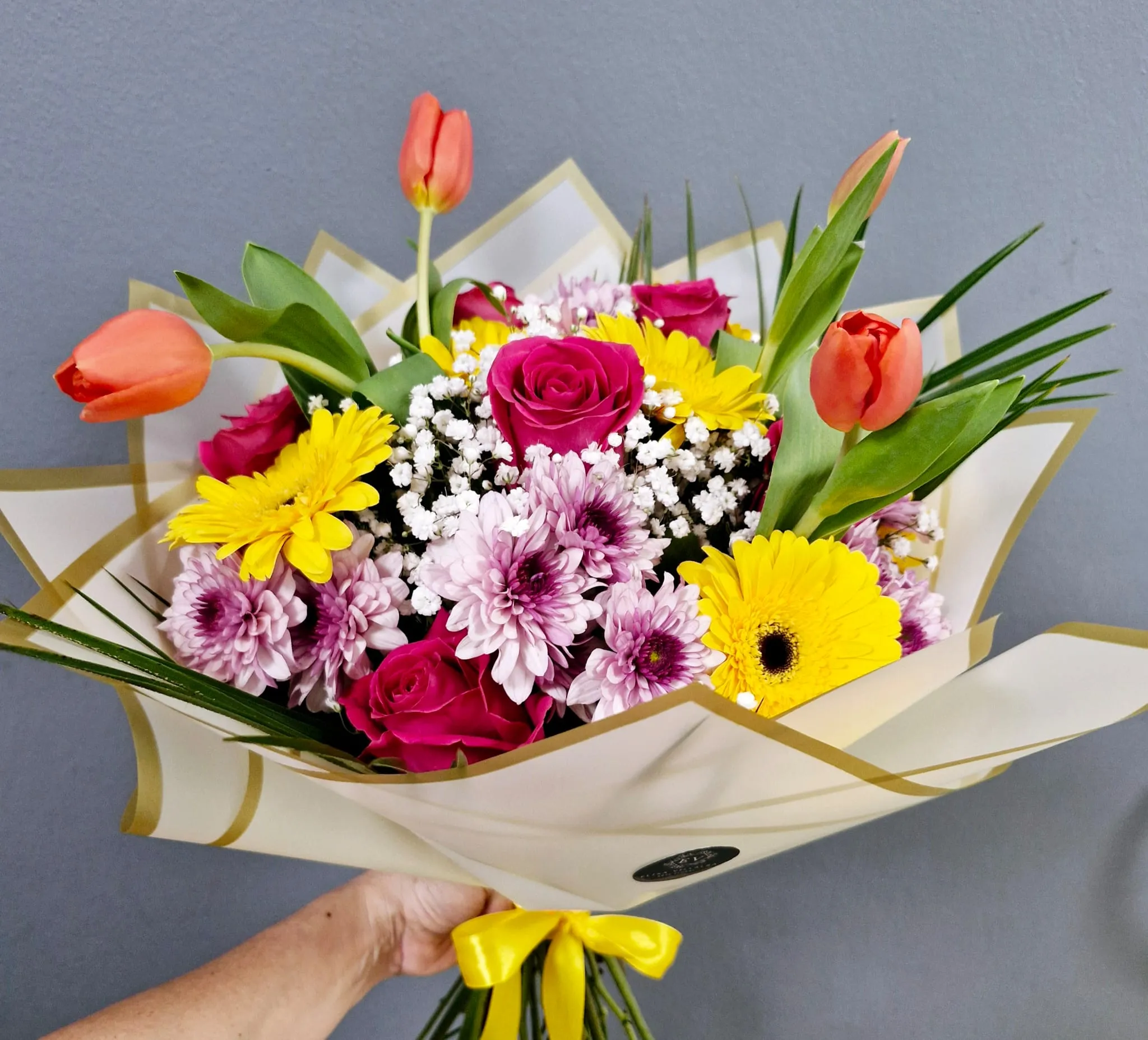 Ramo de flores frescas multicolor, lleno de alegría y energía. Combinamos diferentes tonos y tipos de flores para crear un diseño vivo y desenfadado, perfecto para cumpleaños, agradecimientos o para alegrar cualquier hogar. Incluye envoltorio decorativo y lazo.
