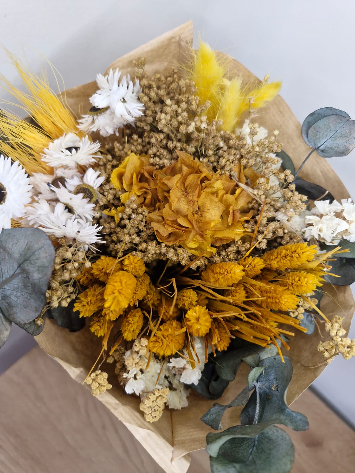 Ramo de flores secas y preservadas presentado en papel kraft natural. Combina un estilo rústico y actual, sin necesidad de agua ni cuidados especiales. Mantiene su forma y belleza durante muchos meses, ideal para decorar salones, recibidores o para regalar como detalle sostenible. No requiere mantenimiento, solo evitar exposición directa al sol y a la humedad. Tonalidad principal: ocre.