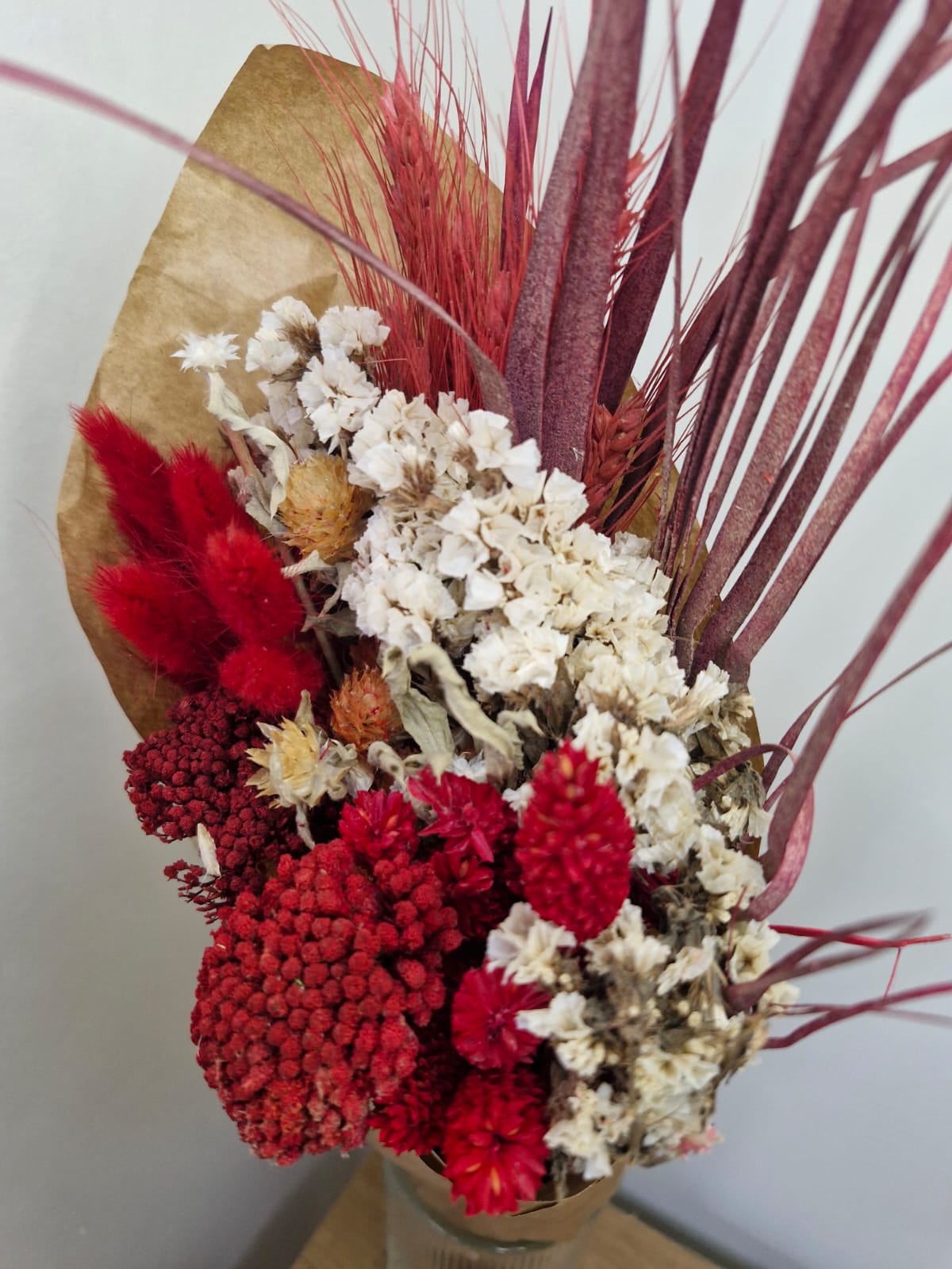 Ramo de flores secas y preservadas presentado en papel kraft natural. Combina un estilo rústico y actual, sin necesidad de agua ni cuidados especiales. Mantiene su forma y belleza durante muchos meses, ideal para decorar salones, recibidores o para regalar como detalle sostenible. No requiere mantenimiento, solo evitar exposición directa al sol y a la humedad. Tonalidad principal: rojo.
