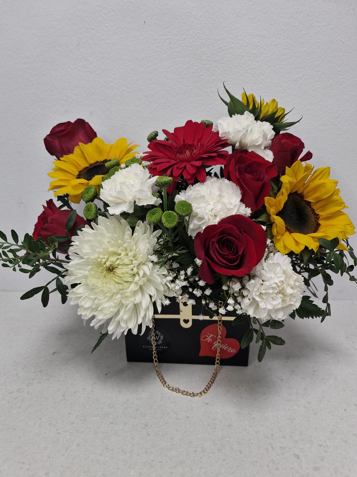 Arreglo floral natural presentado en un elegante bolso con cadena dorada, ideal para regalar en San Valentín. Elaborado con rosas rojas y girasoles, transmite pasión y alegría con un contraste vibrante y lleno de energía.