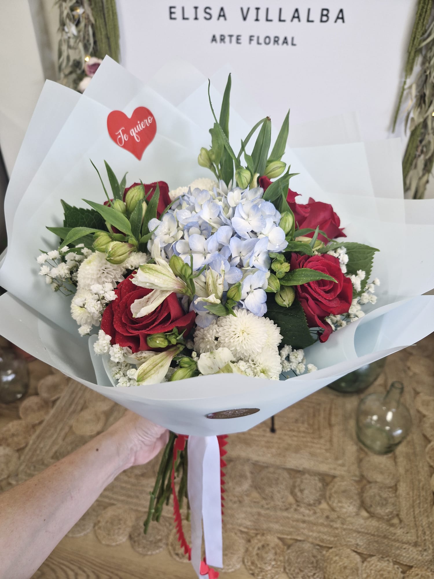 Nuestro ramo Corazón Azul está elaborado con rosas rojas y hortensia azul, acompañadas de delicadas flores blancas, para expresar amor y sofisticación en este día de San Valentín. Presentado en un papel decorativo elegante con acabados cuidados y lazo a tono.