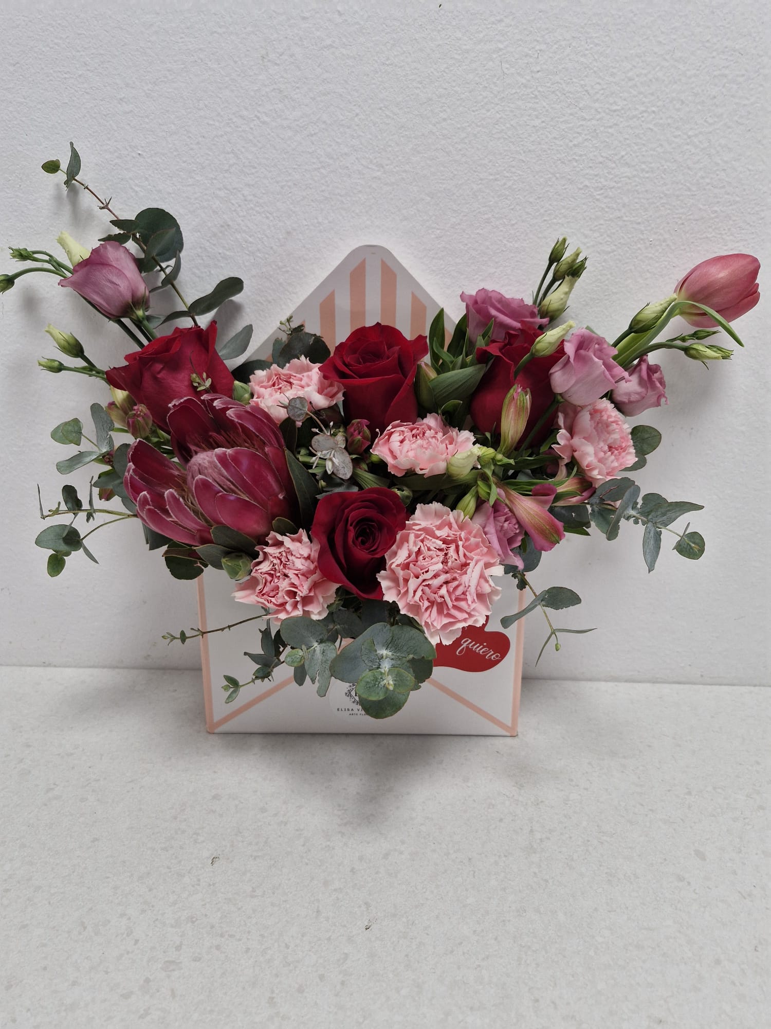Arreglo floral natural presentado en un delicado sobre, pensado como un regalo especial para San Valentín. Compuesto por rosas y tulipanes en tonos rosa, ofrece una estética suave y romántica que expresa ternura y dulzura.
